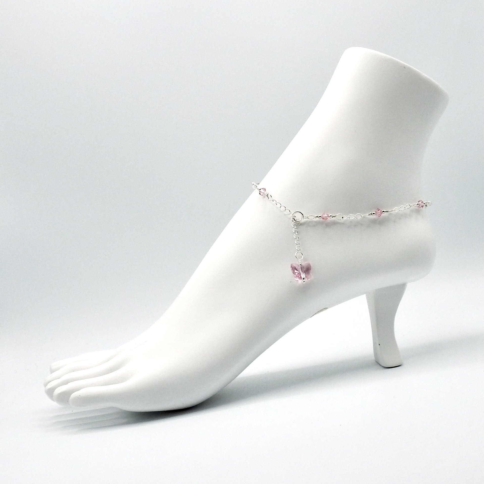 A delicate style adjustable anklet with Swarovski Elements light pink tiny crystal beads and butterfly charm dangle.