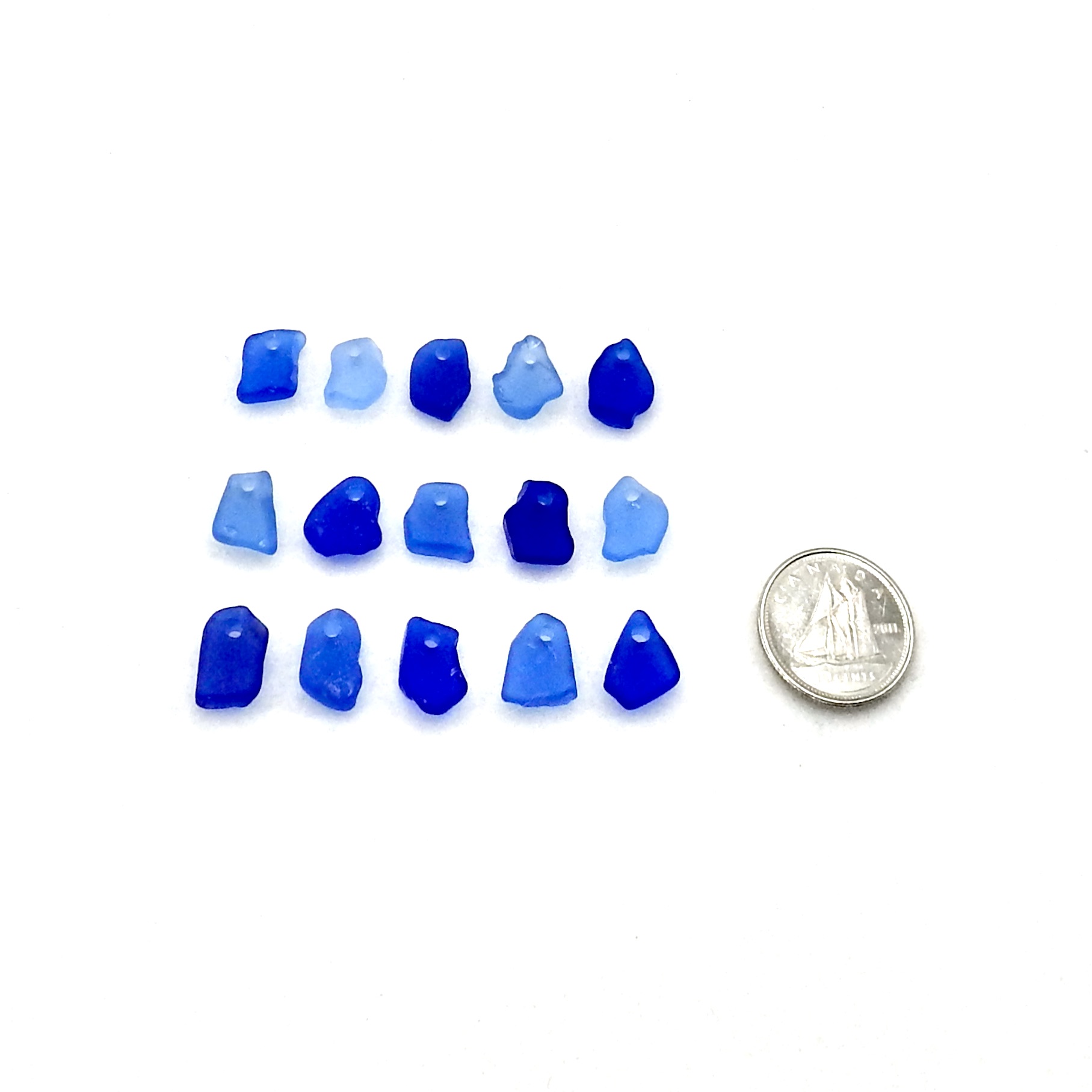 Tiny genuine sea glass charms, set of 15, in shades of cobalt blue and cornflower blue with top drilled holes.
