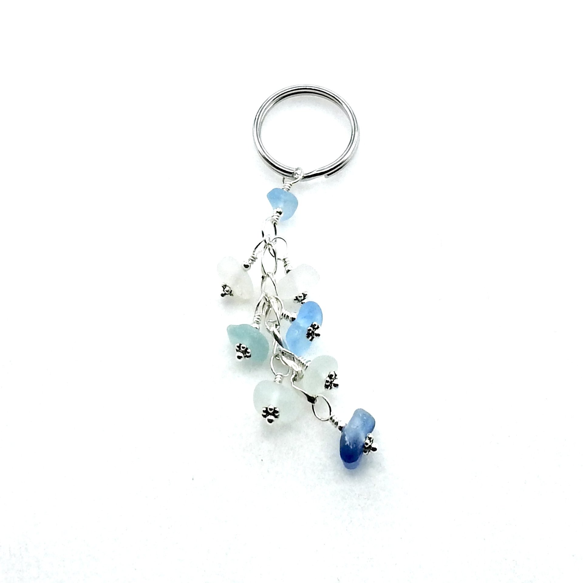 A dangly keychain, handmade with genuine sea glass pieces in shades of white and blue.