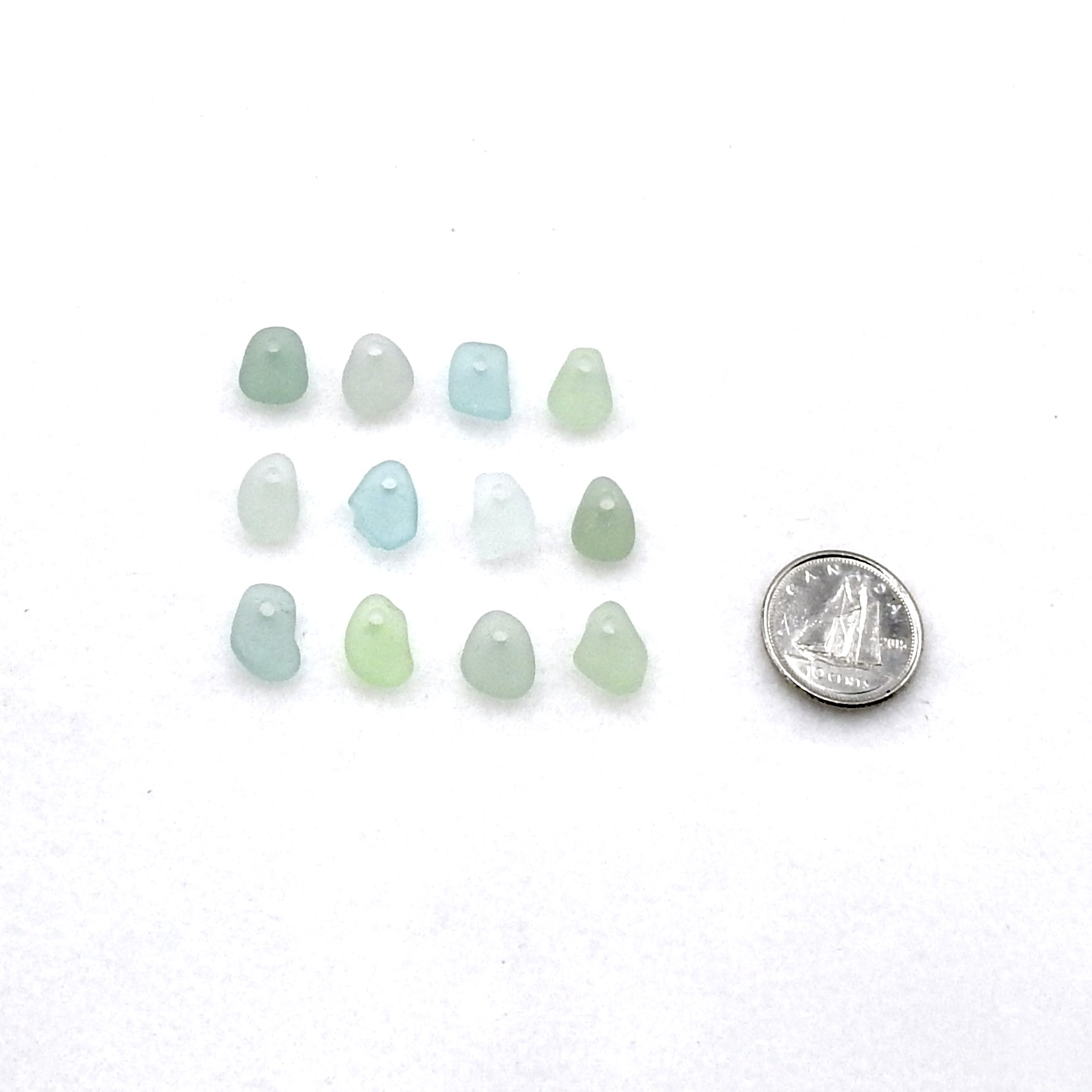 Tiny authentic sea glass charms, set of 12 in light pastel colors with top drilled holes for jewelry making or other DIY crafts.