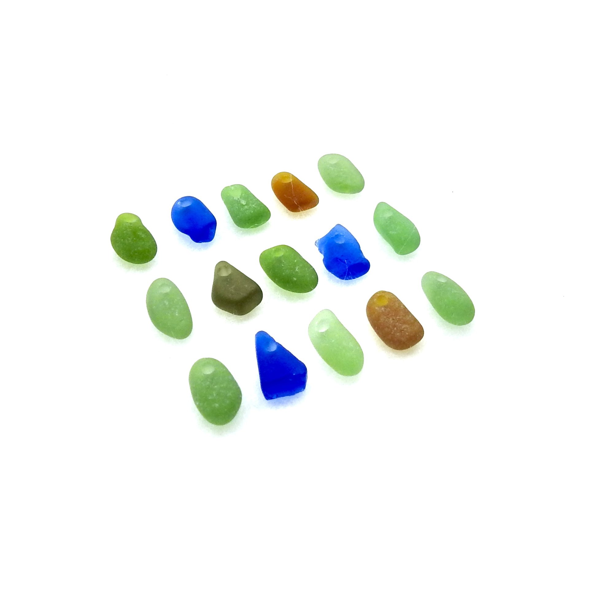 Very tiny genuine sea glass charms, set of 15, in mixed colors with top drilled holes for jewelry making, sew on fringe or other beach themed crafts.