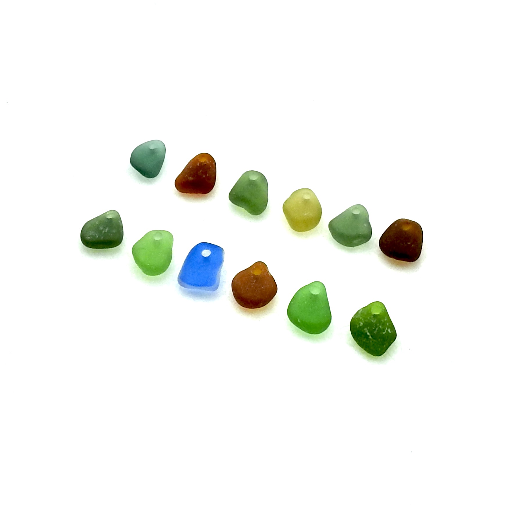 Real sea glass charms, set of 12 in mixed colors with top drilled holes for jewelry making or other beached themed crafts.